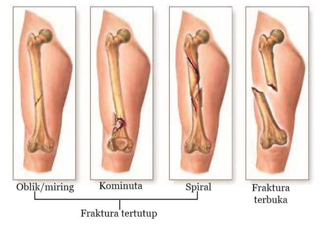 Ada beberapa jenis fraktura, secara umum dapat dikelompokkan menjadi fraktura tertutup dan fraktura terbuka. Jika tulang yang patah tidak sampai menembus kulit disebut dengan faktura tertutup. Fraktura terbuka terjadi jika tulang yang patah keluar menembus kulit. Fraktura juga dapat dibedakan berdasarkan kondisi tulang yang patah, yaitu miring, kominuta (terpecah-pecah menjadi bagian-bagian kecil), dan spiral. Agar kamu tidak mengalami fraktura akibat kecelakaan, berhati-hatilah saat berolahraga.