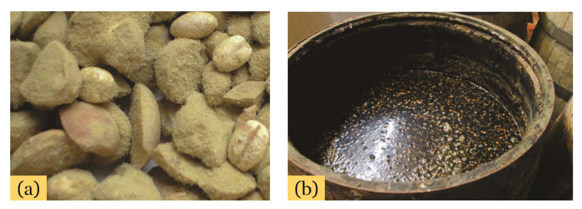 | Gambar (a) Kacang Kedelai yang Telah Ditumbuhi Jamur Aspergillus sojae, (b) Fermentasi Kacang Kedelai |